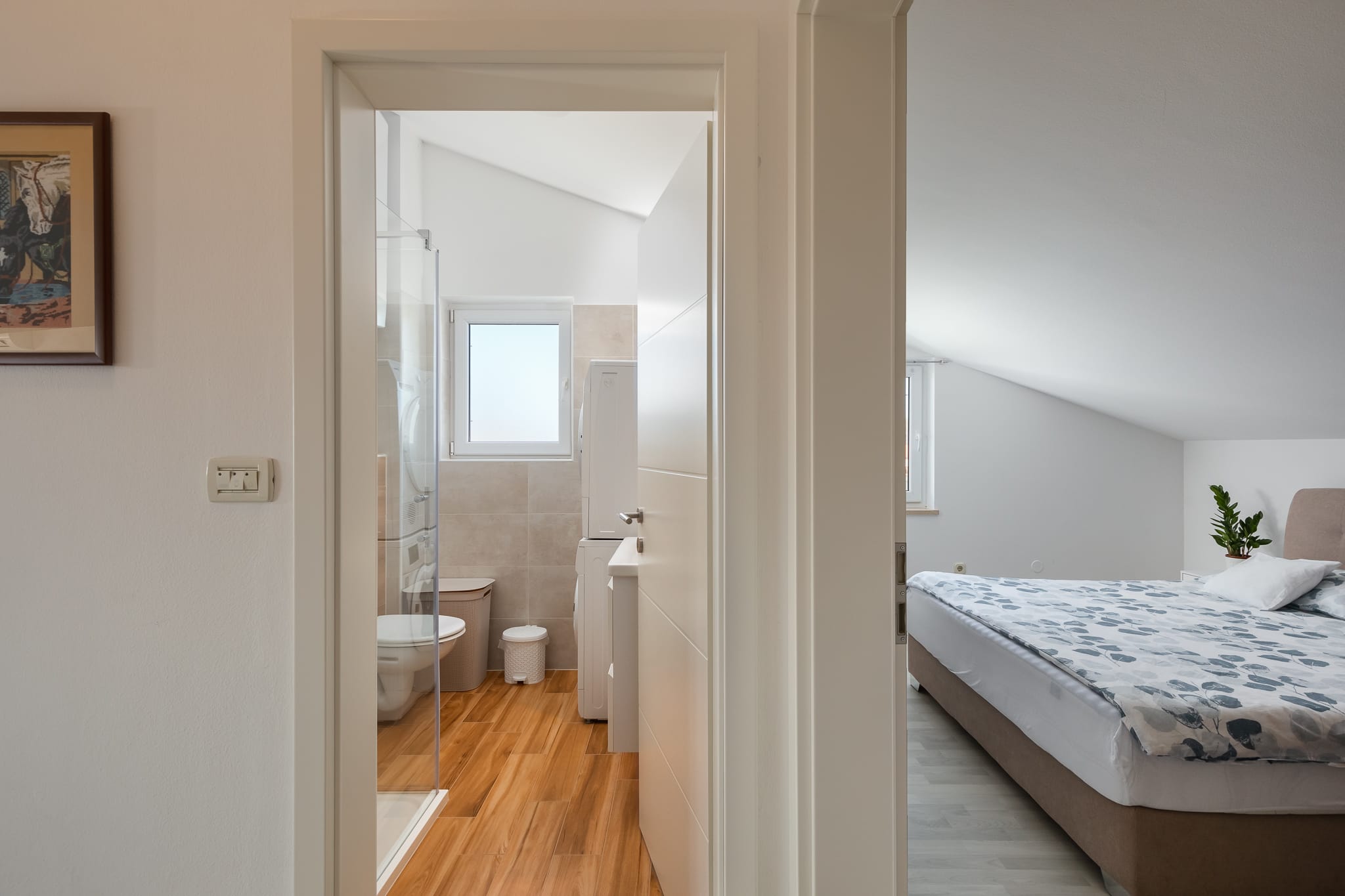 Situated 4 km from Poreč and beach, this lovely and cosy place offer you reserved parking spot in front of building. With plenty of sun and daylight on the second floor this apartment is best for couples with child that want quite and peace. It consists of one Master bedroom with King size bed and large closet. Bathroom equipped with wash machine and laundry dryer, kitchen with oven, dishwasher and other kitchen equipments. Living room with couch that can be bed for children. WiFi is included in price with TV consists plenty of local and foreign tv programs. You can reach within few kilometers plenty of good restaurants and amusements.